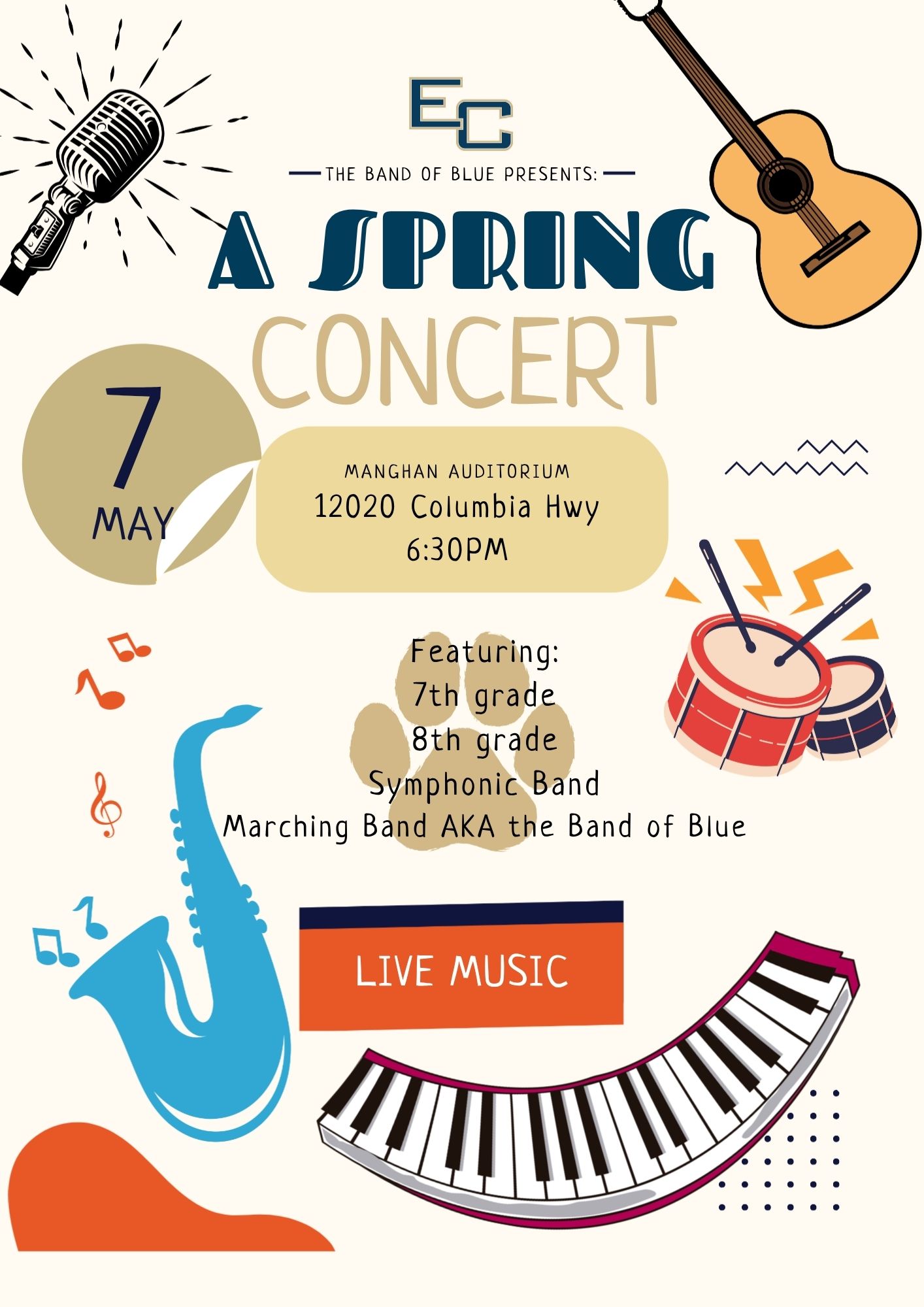 Announcing the annual spring band concert of ECMS and ECHS students under the direction of Dillon King.The public is invited!May 7, 6:30 p.m.Mangham Auditorium